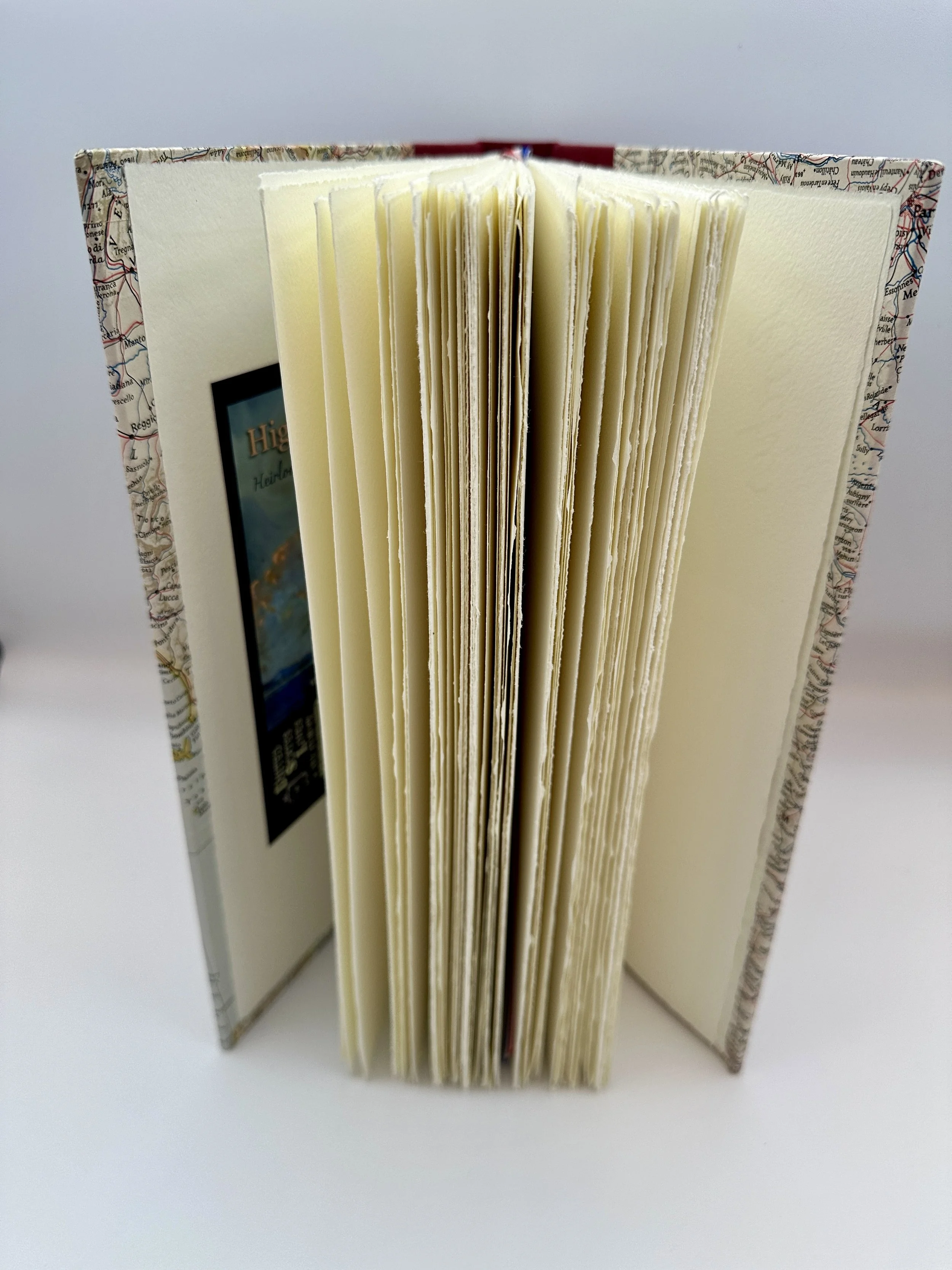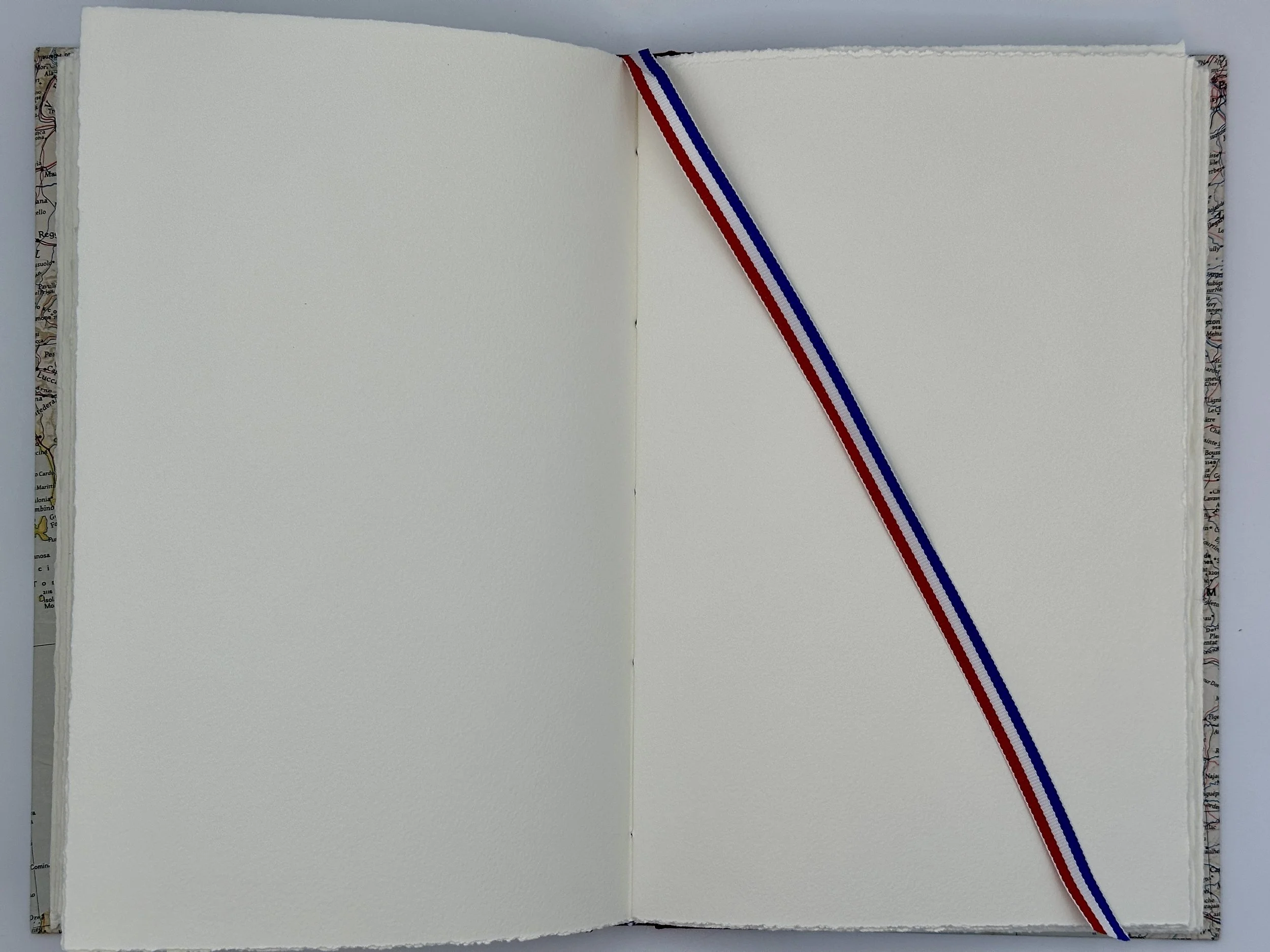 This book’s endbands are blue and white cotton, and its tri-colored grosgrain ribbon. Its spine is covered in French goatskin, and its boards are wrapped in a 1950 map of Europe.