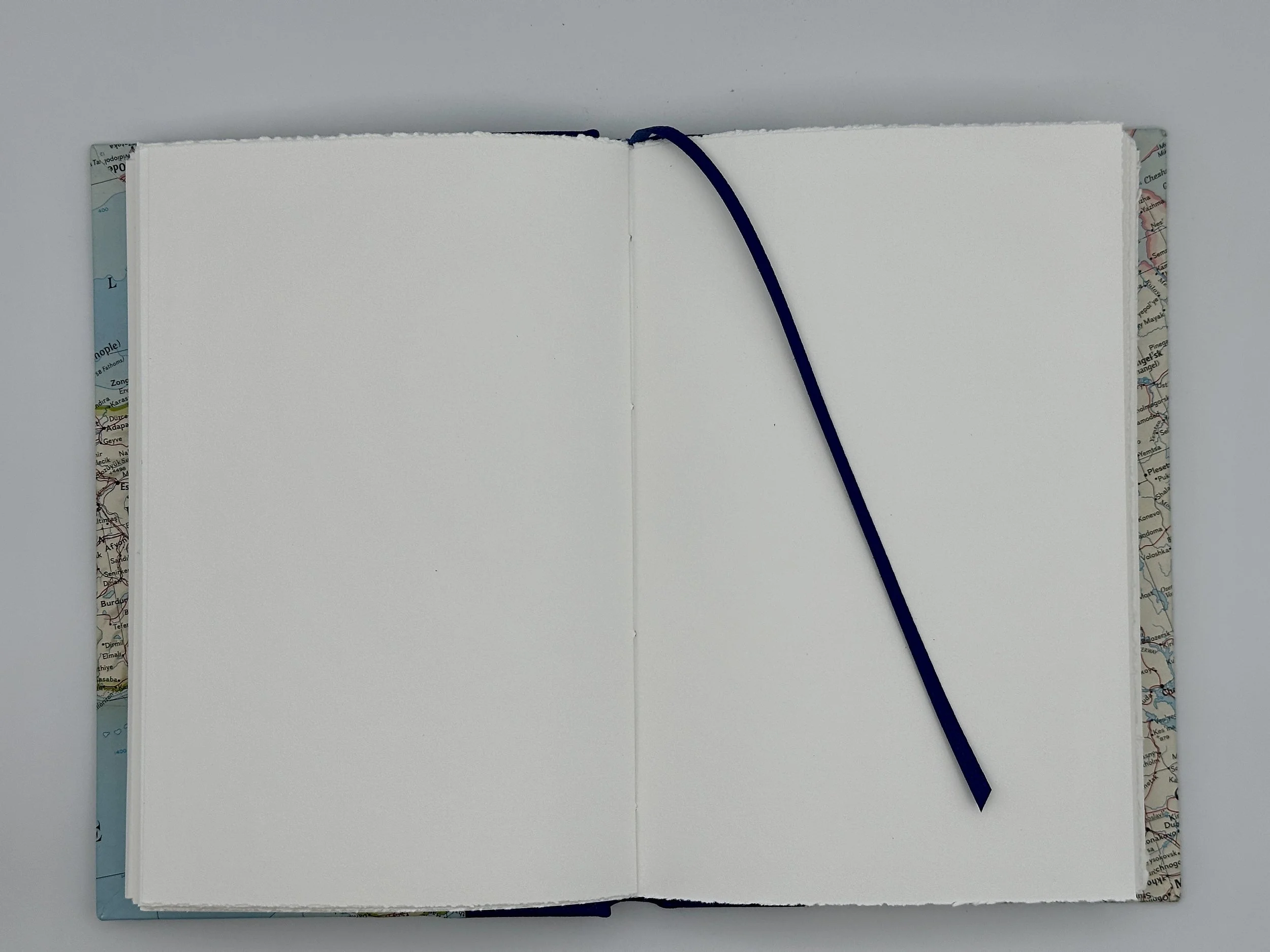 This book’s endbands are blue and white cotton, and its bookmark is goatskin. Its spine is covered in Alran French goatskin that was processed at Rocky Mountain Leather Supply in Utah, and its boards are wrapped in 1 1969 map of Europe.