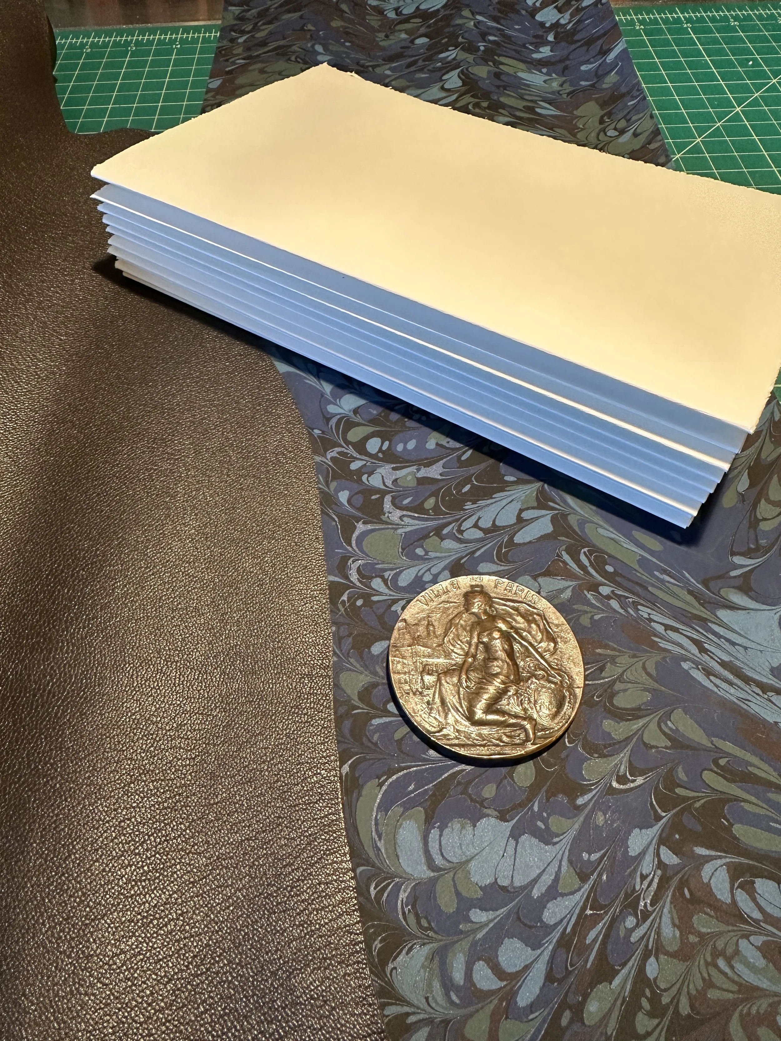 Its boards are wrapped in hand-marbled paper by Katherine Brett at Payhembury Papers in Scotland, and its spine is covered in Alran French Goatskin that was processed at Rocky Mountain Leather Supply in Utah.