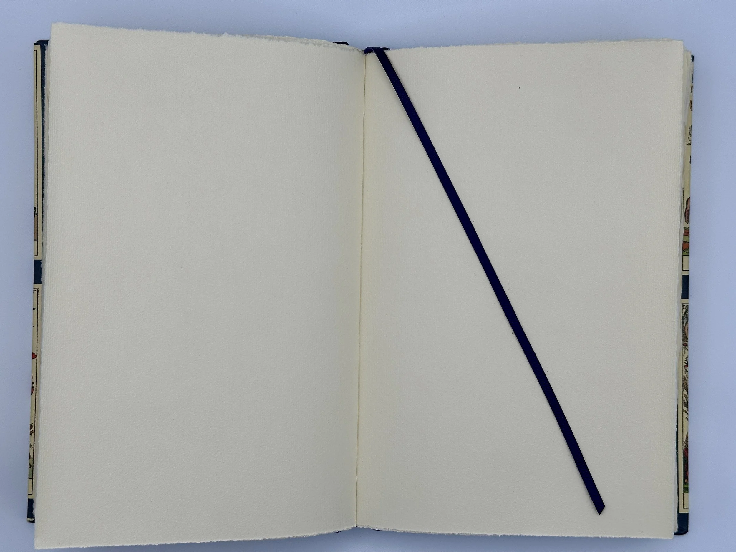 This archival, hand-sewn journal/sketchbook is made from 100 gsm, antique white Hahnemühle Ingres mouldmade paper from Dassel, Germany since 1584, sewn with Irish linen thread in the linked pattern that was developed by the ancient Copts. This stitch allows the book to lay open easily at any page.