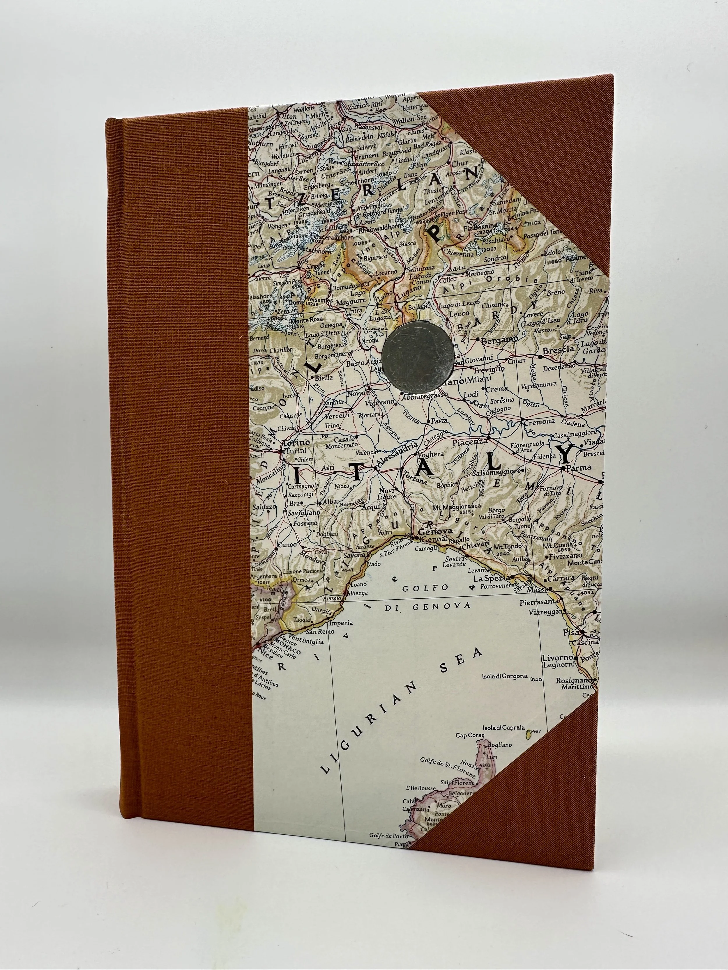 This book’s endbands and bookmark are French goatskin. The book is half-clothed in Brillianta book cloth from the Netherlands, and its boards are wrapped in a 1940 map of Western Europe.