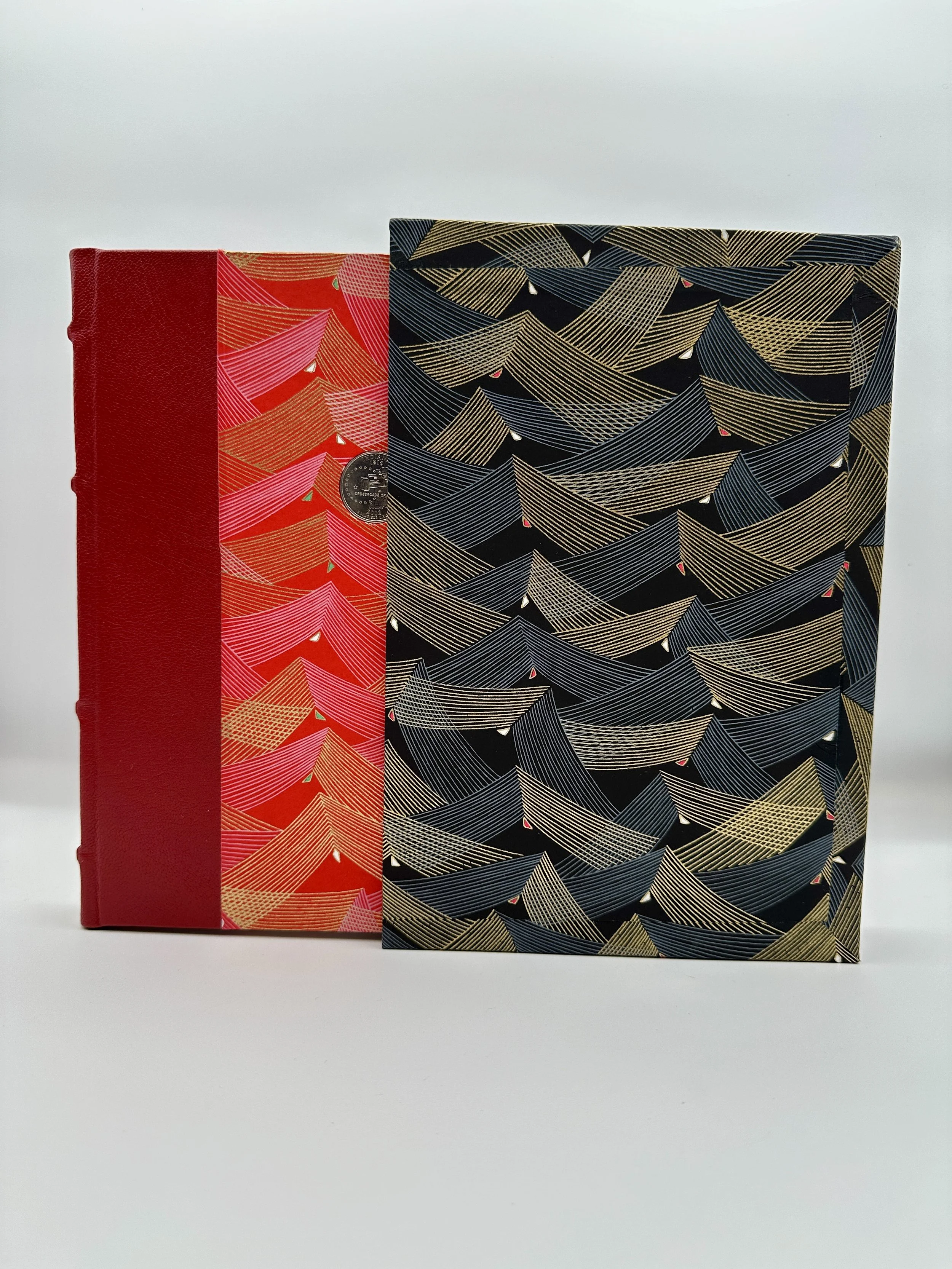 This book’s endbands are sheepskin, and its bookmark is goatskin. Its spine is covered in Alran French goatskin that was processed at Rocky Mountain Leather Supply in Utah, and its boards are wrapped in washi paper that was hand silk-screened in Japan in a factory where kimono silks are printed.