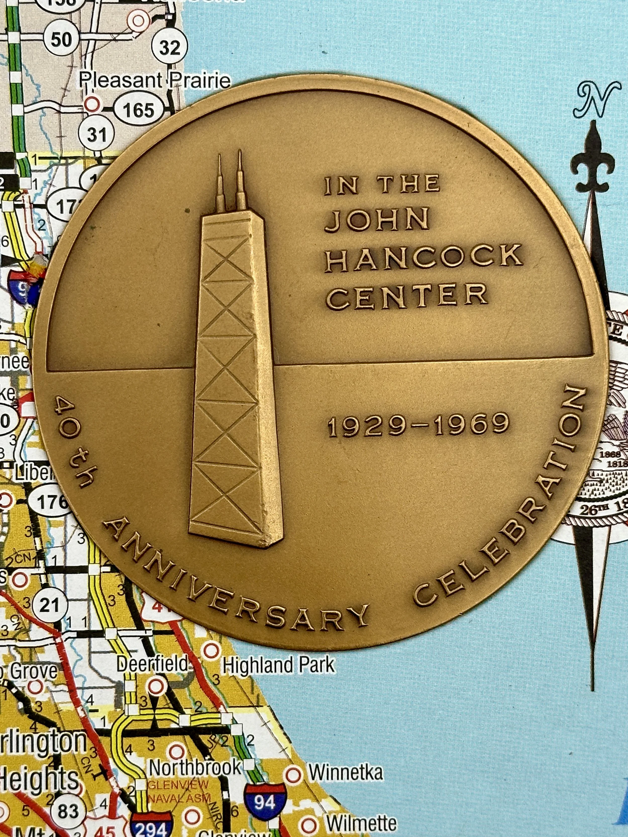 The talisman in this book is a commemorative medallion celebrating the 40th anniversary of the Upper Avenue Bank of Chicago, which moved to the John Hancock Center when the central Chicago landmark that was completed in 1969. The building is 1,127 feet high and weighs more than 340 million pounds. If you’ve been to Chicago, you’ve seen it.
