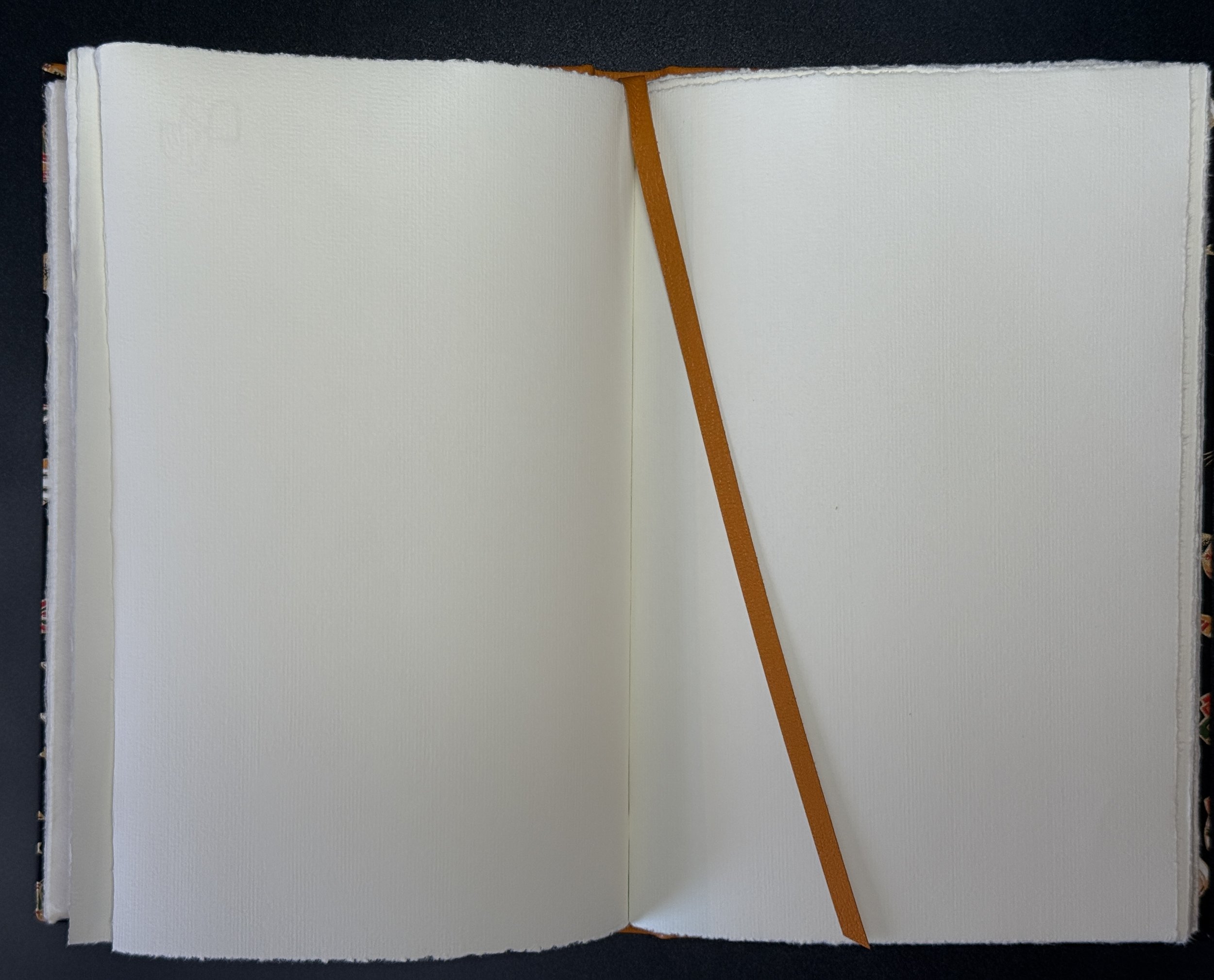 The book’s endbands and bookmark are goatskin. Its boards are wrapped in washi paper that was hand silk-screened in Japan in a factory where kimono silks are decorated, and the spine is covered in Alran French goatskin that was processed at Rocky Mountain Leather Supply in Sandy, Utah.