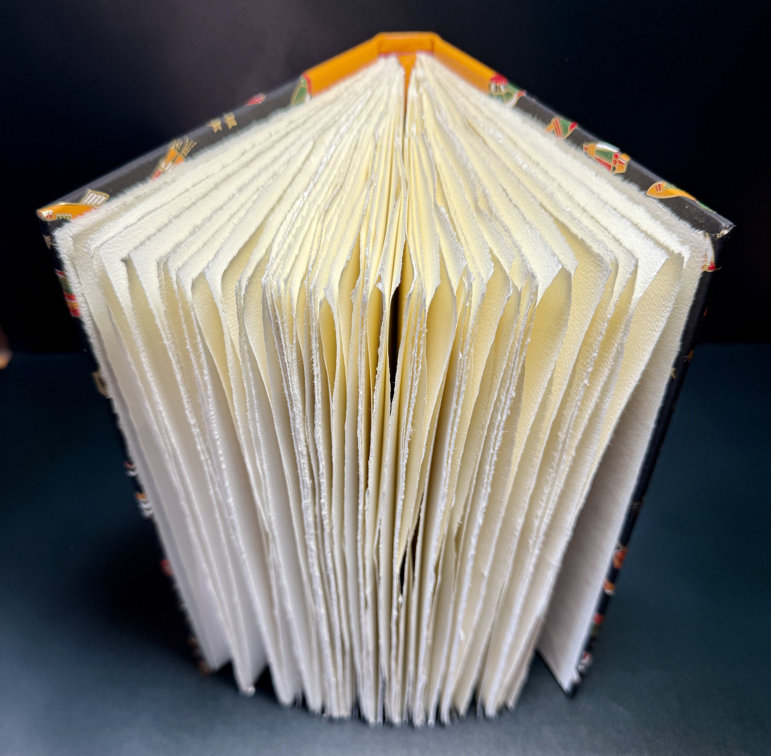 This archival, hand-sewn journal/sketchbook is made from 100 gsm, white Hahnemühle Ingres mouldmade paper from Dassel, Germany, made on the same site since 1584. It is sewn with Irish linen thread in the linked stitch pattern that was developed by the ancient Copts. This stitch allows the book to lay open easily at any page.