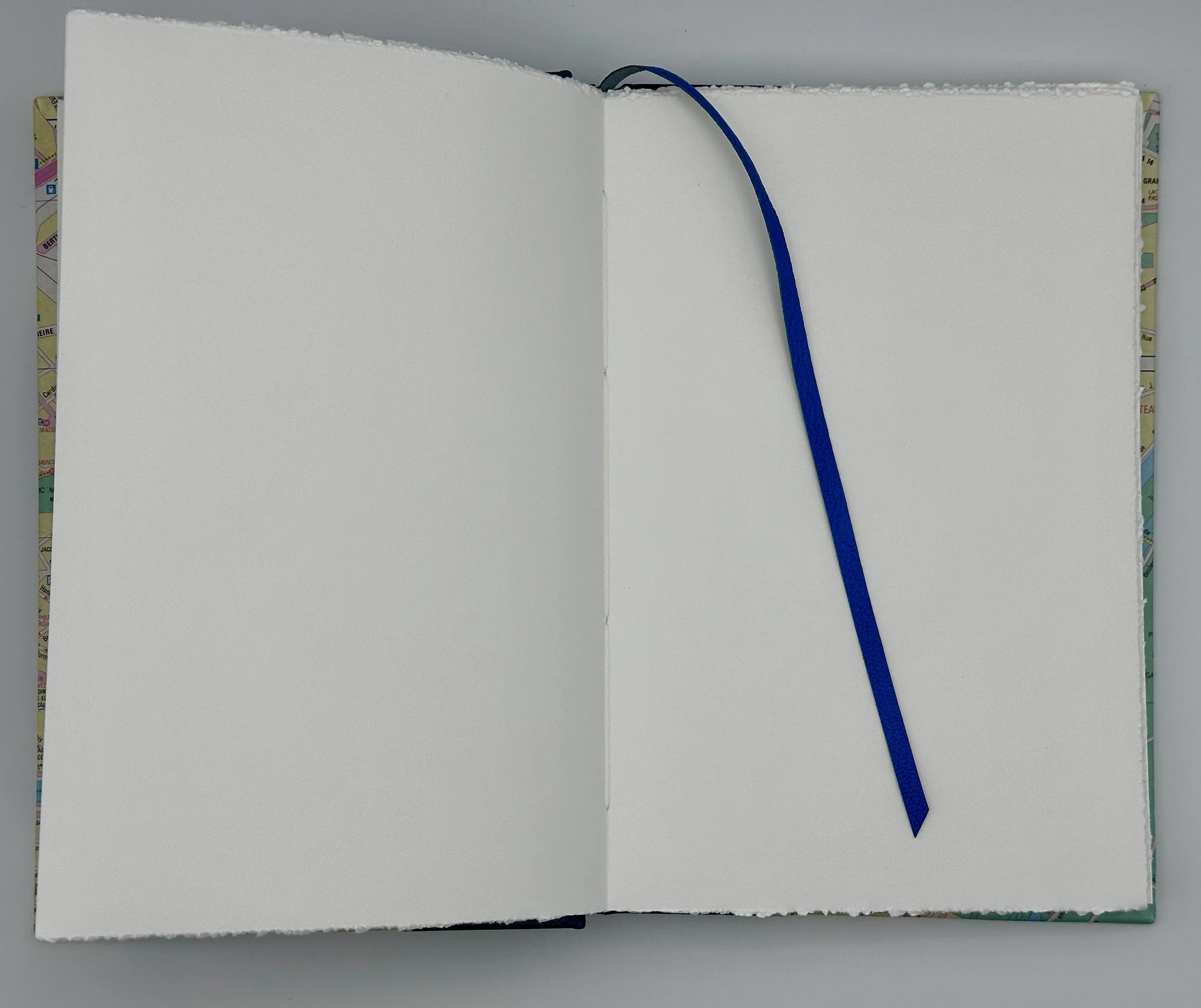 This book’s endbands are blue and white cotton, and its bookmark is goatskin. Its spine is covered in French goatskin that was processed at Rocky Mountain Leather Supply in Utah. Its boards are wrapped in a mid-20th Century Michelin map of Paris.