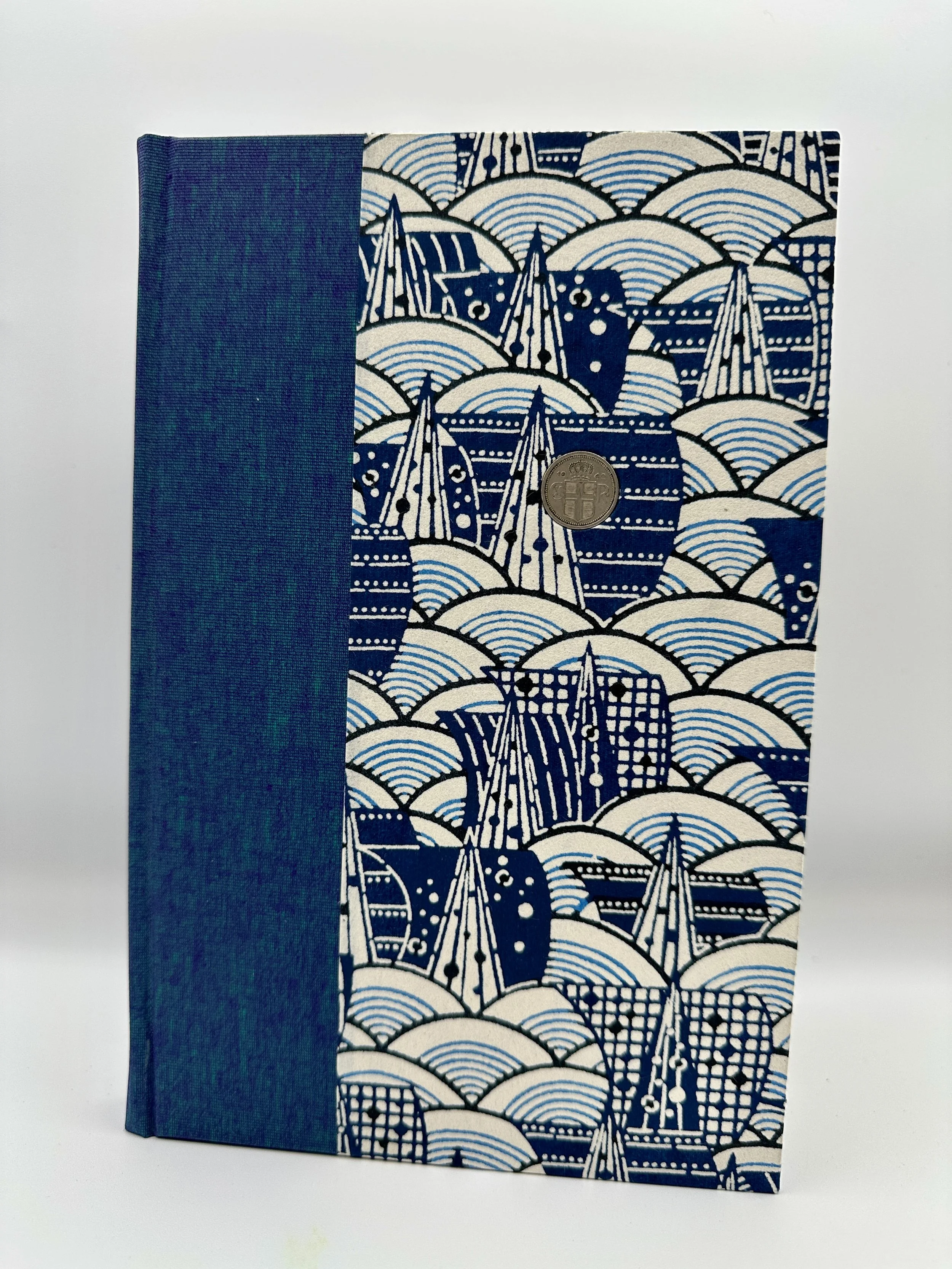 This book’s endbands and bookmark are French goatskin. The spine is covered in Dubletta book cloth from the Netherlands, and its boards are wrapped in paper that was silk-screened in Japan in a factory where kimono silks are printed.